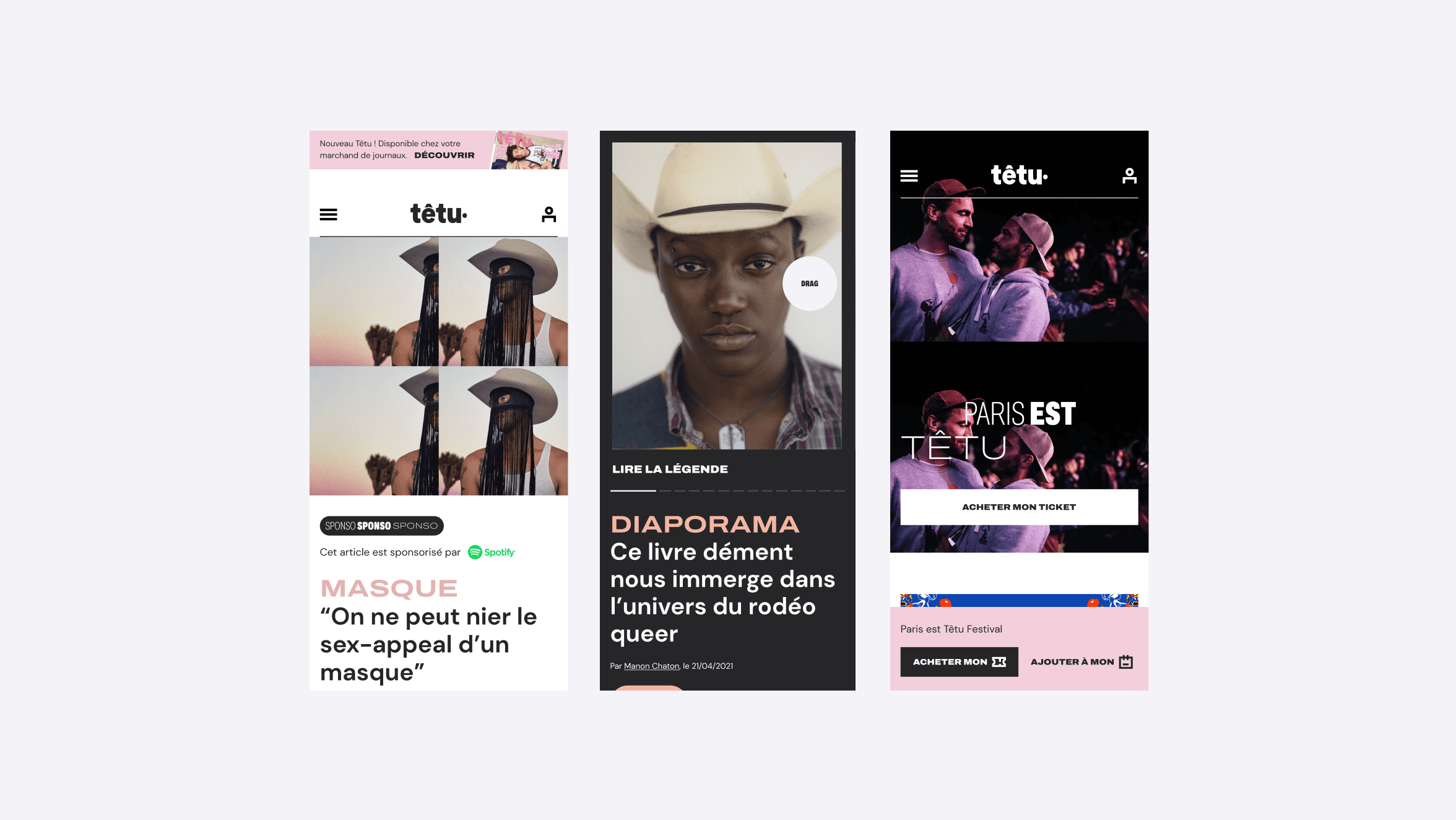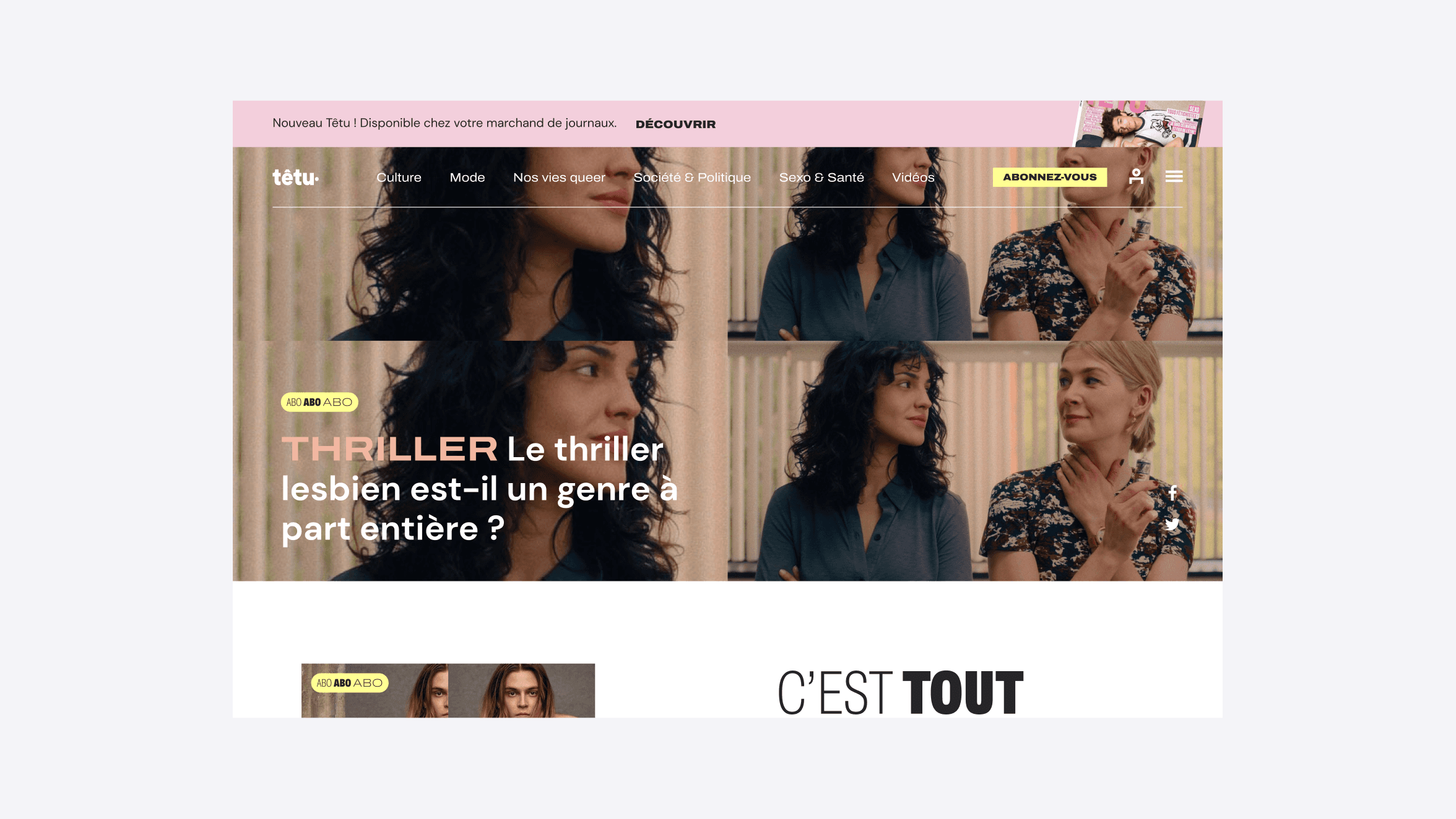 • Traduire les quatre piliers éditoriaux du média (informer, incarner, divertir, célébrer) en une expérience digitale qui prolonge l’ADN du print • Mettre en lumière la pluralité des voix et identités LGBTQIA+ grâce à un système visuel modulable et vivant • Concevoir une architecture éditoriale scalable pour accueillir l’ensemble des verticales et garantir une expérience cohérente sur tout l’écosystème têtu Résultats et impacts : • +50 % de trafic en visites uniques mensuelles entre 2018 et 2019 (1 million de visiteurs uniques/mois) • 3x plus de pages vues par visite • De 1 500 à près de 5 000 abonnés payants Projet réalisé chez Cosa Crédits photos ©têtu